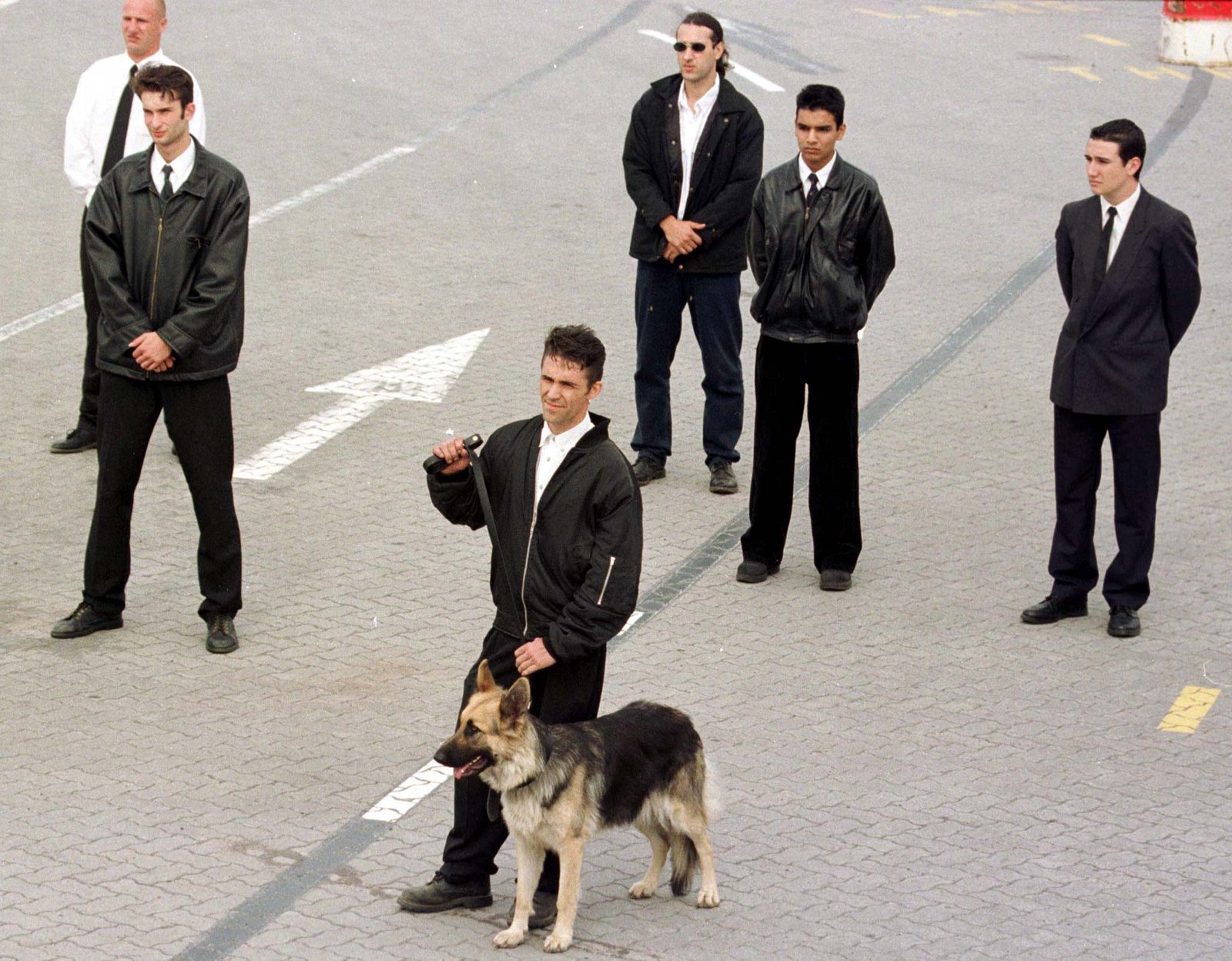 Security guards stood by as they were harangued by sacked wharf workers at Melbourne's Webb Dock. (Reuters)