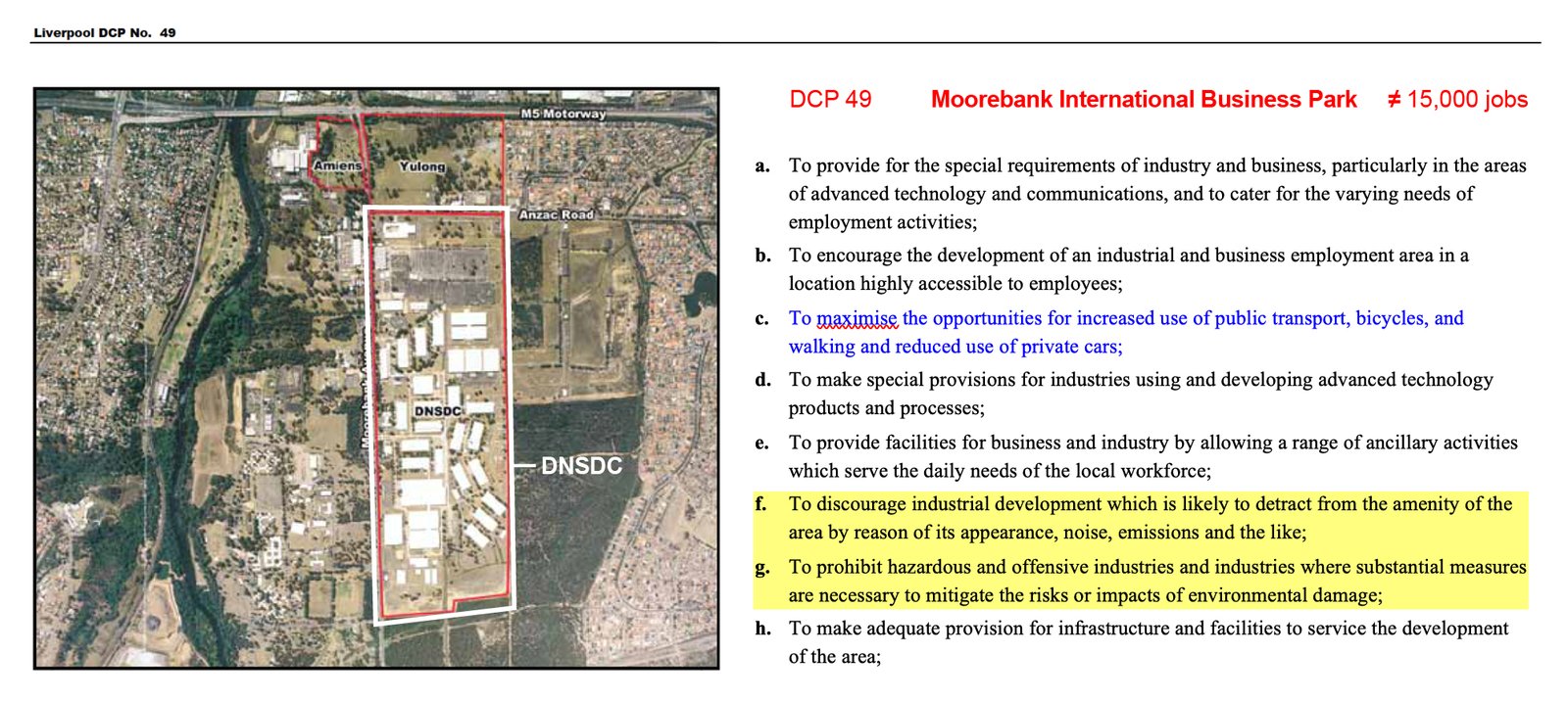 Note above, Liverpool City Council’s Development Control Plan 49 of 2003, set aside Amiens Park, Yulong Oval and the DNSDC for an International Business Park focused on “advanced technology and communications”. The intention was to deliver 15,000 jobs, with access to Casula Train Station and a new Train Station on the Airport Line, which could be joined by the long planned Casula Y Link (since 1998) 12 representing public transport access from three directions and parts of Sydney. Additionally and incredibly this plan was to “discourage industrial development which is likely to detract from the amenity of the area by reason of its appearance, noise, emissions”; prohibit hazardous and offensive industries and industries where substantial measures are necessary to mitigate the risks or impacts of environmental damage”; and make adequate provision for infrastructure and facilities to service the development of the area.”