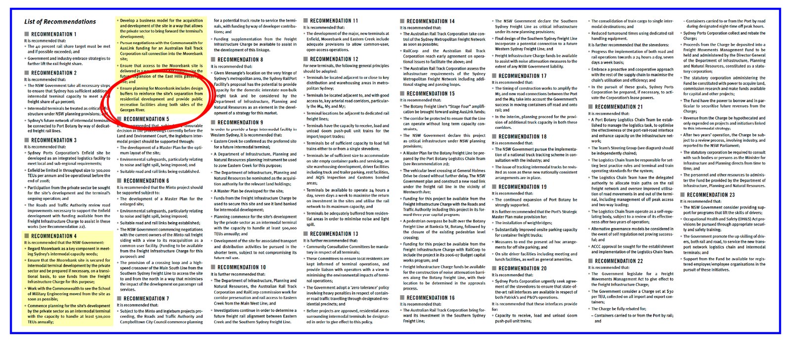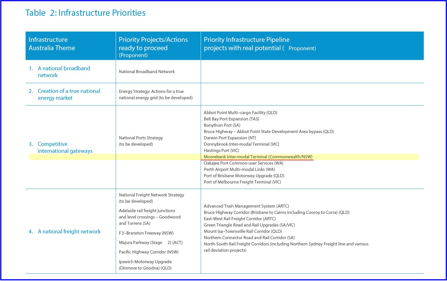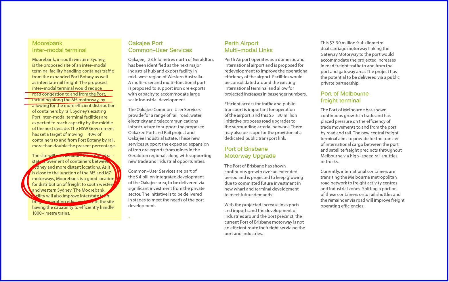 As discussed last week “Moorebank is listed as just 1 of 23 recommendations in the FIAB report of 2005 [see image], which will have been directly influenced by the federal government announcement of Moorebank being added basically by fiat to the AusLink program in 2004,” 2 he explained, and cited in last weeks article. Thus having traced the projects’ history, North identifies both projects were ultimately and solely pushed without proper scrutiny let alone adequate science.