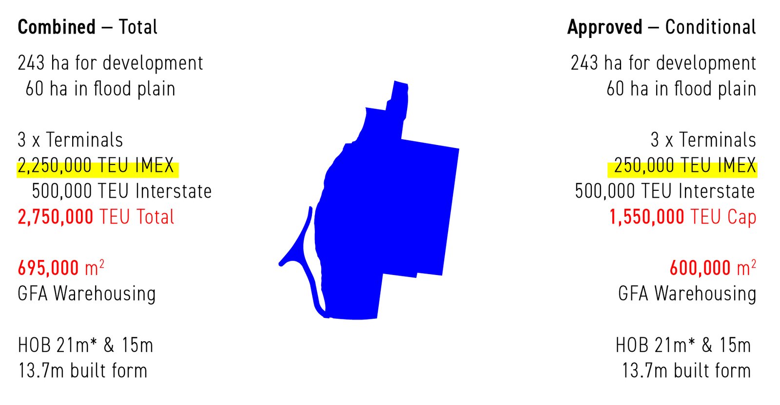 The impacted communities were told “one not both, buuuuut we got both” Eric lamented. The impacted communities were also told that Moorebank Ave would not be moved, a year later maps in both corporate and government pubic documentation showed Moorebank Ave as already realigned to the east. Per initial applications three terminals servicing 2.75 million TEU (twenty foot container of equivalent units) partially through 695,000 m2 of warehousing is the arithmetic total, and while an administrative cap of 1.55 million TEU was placed on the projects initially approved at 750,000 TEU (250,000 IMEX and 500,000 Interstate) and 600,000 m2 of warehousing, the reality is that the physical capacity of the terminals likely remains 2.75 million TEU. Which as it happens is more containers than is currently traveling though Port Botany itself.